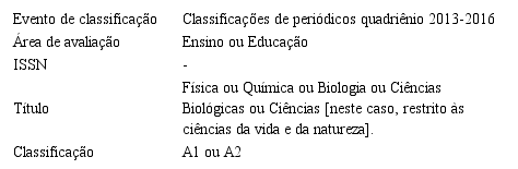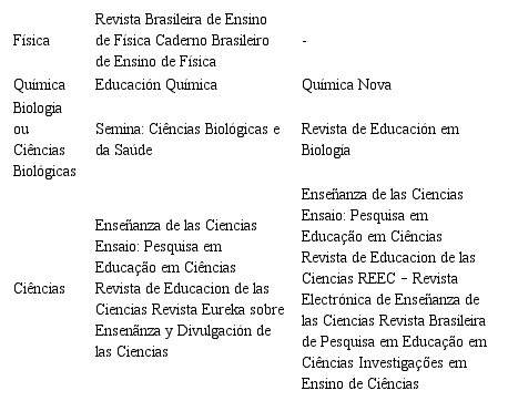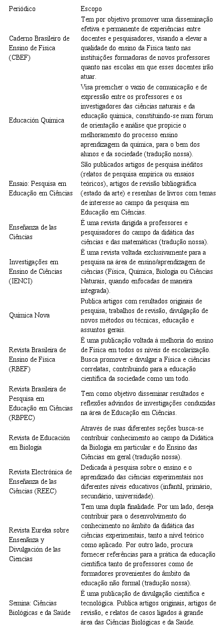 Como percebemos no quadro 2, treze distintos periódicos se enquadraram nos critérios de busca que estabelecemos: Caderno Brasileiro de Ensino de Física; Educación Química; Ensaio: Pesquisa em Educação em Ciências; Enseñanza de las Ciencias; Investigações em Ensino de Ciências; Química Nova; Revista Brasileira de Ensino de Física; Revista Brasileira de Pesquisa em Educação em Ciências; Revista de Educacion de las Ciencias; Revista de Educación em Biología; REEC – Revista Electrónica de Enseñanza de las Ciencias; Revista Eureka sobre Ensenãnza y Divulgación de las Ciencias; Semina: Ciências Biológicas e da Saúde. Os escopos desses periódicos, de acordo com as informações constantes em seus sites, são os apresentados no quadro 3.