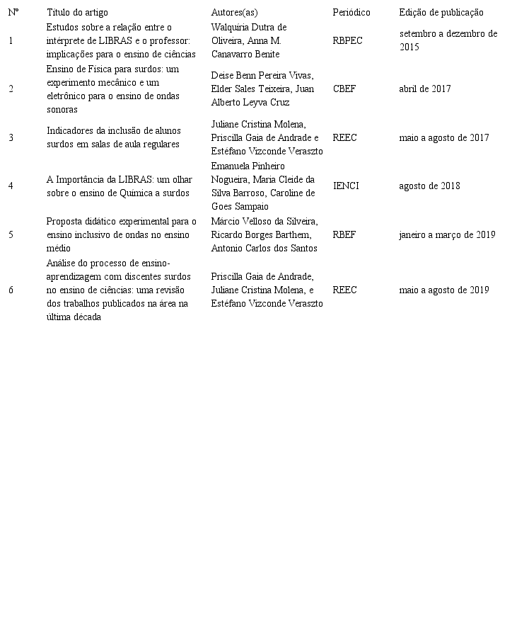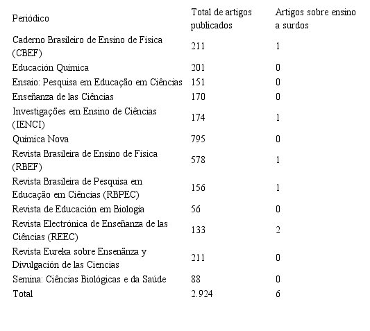 Dos artigos encontrados, apenas seis, publicados entre 2006 e 2012, contemplavam o tema da pesquisa: Um estudo de possíveis correlações entre representações docentes e o ensino de ciências e matemática para surdos (Borges e Costa, 2010); Estudo de planejamento e design de um módulo institucional sobre o sistema respiratório: o ensino de ciências para surdos (Queiroz, Silva, Macedo e Benite, 2012); Ensino de ciências para deficientes auditivos: um estudo sobre a produção de narrativas em classes regulares inclusivas (Oliveira, Melo e Benite, 2012); Terminologias químicas em libras: a utilização de sinais na aprendizagem de alunos surdos (Souza e Silveira, 2011); Aula de química e surdez: sobre interações pedagógicas mediadas pela visão” (Pereira, Benite e Benite, 2011); Utilizar as TIC para ensinar física a alunos surdos: estudo de caso sobre o tema ‘a luz e a visão (Paiva, 2006).