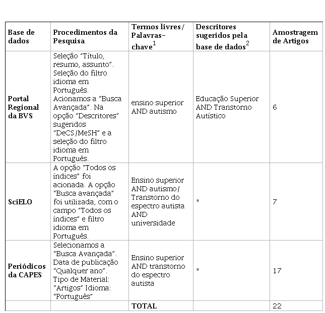 Os artigos selecionados para a Revisão Integrativa atenderam aos seguintes critérios de inclusão: abordar a inclusão em nível superior; estar direcionado aos estudantes universitários com TEA; estar relacionado a estudos que contemplem IES Brasileiras; estar escrito em Língua Portuguesa. Foram excluídos os seguintes estudos: artigos repetidos entre as bases de dados consultadas; artigos de revisão de literatura; artigos que se referiam a outros estudantes públicos-alvo da Educação Especial, sem ser exclusivamente estudantes universitários com TEA.