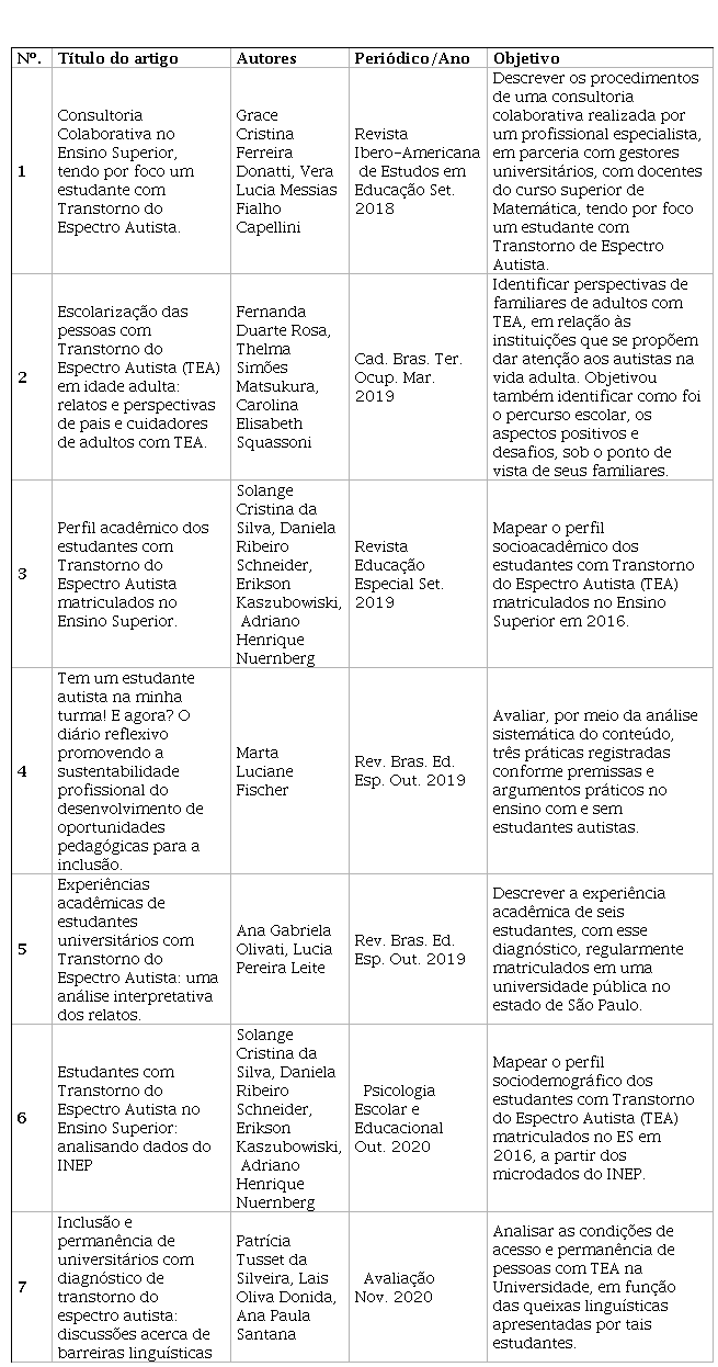 Com relação ao número expressivo de universitários com TEA, destaca-se que 1217 estudantes estão presentes em microdados das pesquisas de Silva e colaboradores (2019 e 2020), obtidos no Censo da Educação Superior do INEP3 de 2016, 6 estudantes têm sua experiência acadêmica descrita pelas pesquisadoras Olivati e Leite (2019), 2 estudantes são contemplados no estudo de Fischer (2019), o qual visou a aplicar práticas pedagógicas e de ensino inclusivas, 1 estudante é alvo de um trabalho de consultoria colaborativa (DONATTI; CAPELLINI, 2018) e 2 estudantes participaram de avaliações fonoaudiológicas (SILVEIRA; DONIDA; SANTANA, 2020).