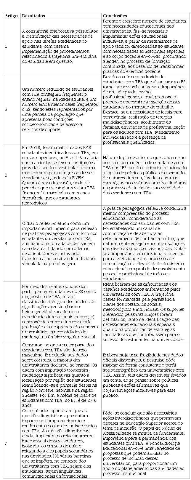 Esta Revisão Integrativa da Literatura, cujos resultados desempenham um papel importante na identificação da escassez de estudos sobre a inclusão do estudante universitário com TEA, cumpriu especificamente o objetivo de fornecer um panorama sobre a situação dos alunos e docentes nas universidades brasileiras, no que diz respeito ao tema.