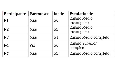 Quanto à escolaridade, P1 e P2 possuíam Ensino Médio incompleto; P3 e P5 Ensino Médio completo e apenas P4 possuía Ensino Superior. A partir desse perfil pode-se potencializar efetiva análise no item resultados e discussões, o qual será apresentado posteriormente.