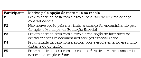Com base nos fragmentos de relatos apresentados no Quadro 2, foi possível verificar que a proximidade da escola em relação ao domicílio da criança é um dos principais motivos para a matrícula, como ocorreu com P1, P3, P4 e P5.