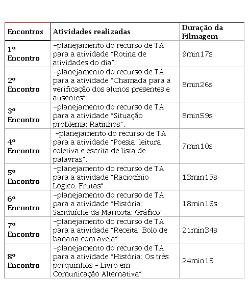 A intervenção proposta contemplou etapas de planejamento dos recursos de TA e das atividades em sala e sua aplicação. Especificamente quanto ao planejamento, foram realizados oito encontros entre a professora da classe comum, a agente educacional e a pesquisadora, e tinham como alvo a definição das atividades do currículo da Educação Infantil – Infantil II propostas ao longo das semanas e as adaptações necessárias mediante os recursos de TA. O Quadro 1 ilustra os temas e a duração dos encontros para planejamento: