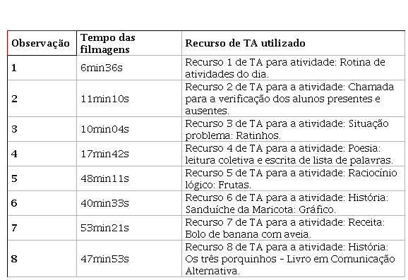 Para a análise das filmagens, aplicou-se o protocolo de observação sistemática desenvolvido para o estudo, de modo a caracterizar a utilização do recurso de TA por meio do desenho universal, o comportamento da aluna com paralisia cerebral frente ao uso desse recurso, atuação da professora e da agente educacional.