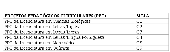 No primeiro semestre do ano de 2019, encaminhou-se um e-mail às coordenações dos cursos de licenciatura da UFAC, solicitando os PPC desses cursos e informando o objetivo. As coordenações dos cursos de licenciatura em Ciências Biológicas, Letras/Libras, Letras/Inglês, Letras/Língua Portuguesa, Matemática e Química responderam prontamente à solicitação. Outras coordenações não responderam aos email-s e não sendo localizados no repositório institucional, os demais PPC foram excluídos desta análise. Compreende-se que pelo fato de uma das autoras ministrar aulas nesses cursos e manter contato, portanto, com tais coordenações, o acesso e a comunicação foram melhor efetivados e a solicitação prontamente atendida.