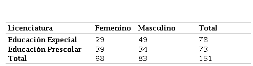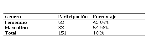 La muestra estuvo conformada por 151 estudiantes de México, quienes llenaron esta encuesta en la fase preliminar de dos cursos en diferentes ambas licenciaturas. Esta población pertenece a diferentes comunidades de un entorno rural y semiurbano. Su edad estaba comprendida entre los 18 y los 22 años, con 83 participantes masculinos (54,3%) y 68 femeninos (45,7%). Su edad media fue de 20 años. Se realizó una investigación descriptiva, con un diseño transversal no experimental. La participación fue voluntaria donde se les invito a participar explicando el fin de la investigación, además se les comento que su participación seria de manera anónima, y no se ofrecieron incentivos a los participantes.