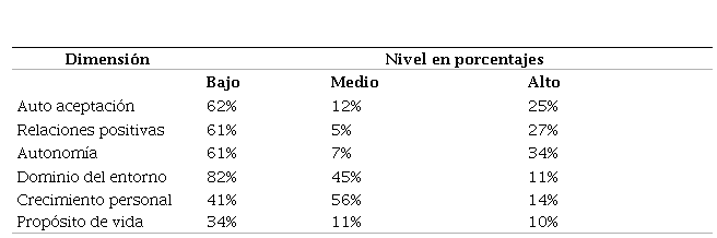 En los niveles medio y bajo de bienestar psicológico obtuvieron puntuaciones más altas. El crecimiento personal fue la dimensión predominante, en el nivel medio, seguido de la dimensión de propósito en la vida.
