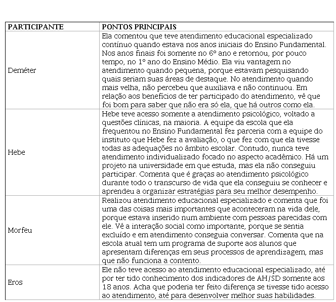 Dois participantes, Deméter e Morfeu, tiveram acesso ao atendimento educacional especializado durante a sua escolaridade básica. Deméter participou do atendimento enquanto cursava as séries iniciais do Ensino Fundamental, sendo que Morfeu foi além, realizando esse atendimento até as séries finais do Ensino Fundamental. A participante Hebe teve acesso a um programa de suporte ao estudante superdotado quando ingressou no Ensino Superior, mas teve acompanhamento de psicóloga desde a identificação da superdotação. Somente Eros não teve acesso a qualquer tipo de programa de suporte ao estudante superdotado, o que pode ser justificado pelo desconhecimento dele acerca da sua condição até a idade de 18 anos.