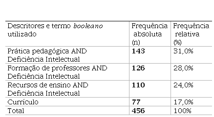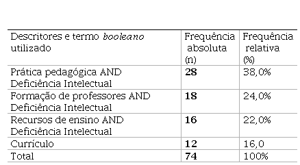 Para confirmar a frequência mais alta de termos relacionados às práticas pedagógicas e formação de professores foram efetuados testes de buscas na BDTD e durante tais testes os termos mais frequentes foram: prática pedagógica (incluindo plural), formação de professores, recursos de ensino e currículo. Esses descritores foram definidos e combinados com o descritor Deficiência Intelectual utilizando o operador Booleano AND, para que fosse obtido um resultado mais específico. Essa foi a principal estratégia de busca definida.