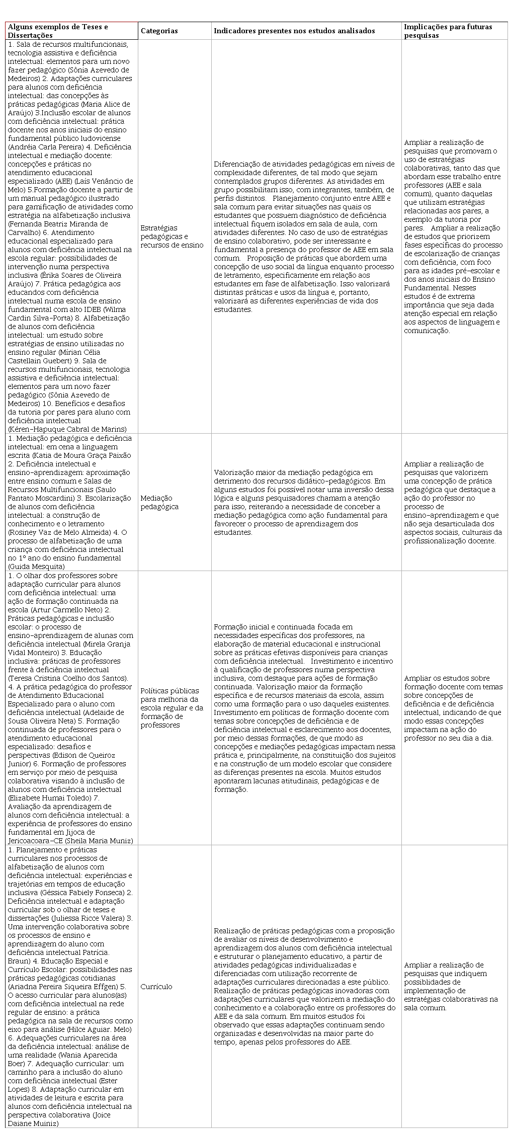 De modo geral, observou-se uma predominância de estudos descritivos que buscam identificar concepções de professores sobre a deficiência intelectual, caracterizar as práticas pedagógicas desenvolvidas com esses estudantes e, em menor expressão, há também estudos que analisam essas práticas do ponto vista documental, seja considerando as políticas existentes no âmbito nacional voltadas especificamente para esse público, seja em relação aos documentos da escola, principalmente, o planejamento docente.