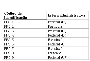 Os PPC analisados se encontravam disponíveis nos sites das IES, o que possibilitou o acesso aos dados. Entre as IES analisadas temos cinco (5) federais (3 IF e 2 UF), três (3) estaduais e apenas uma (1) é particular. O quantitativo de IES particular foi reduzido devido a indisponibilidade de acesso ao PPC apesar de ser uma exigência pelo MEC. Por motivos éticos optamos por não identificar as IES.