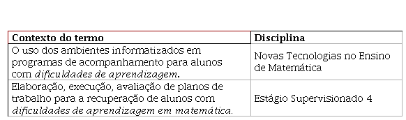 Com relação ao termo “dificuldade de aprendizagem”, dos 9 PPC investigados, em apenas uma (11,11%) esse termo foi encontrado. A apresentação desses dados se encontra no quadro 2 a seguir.