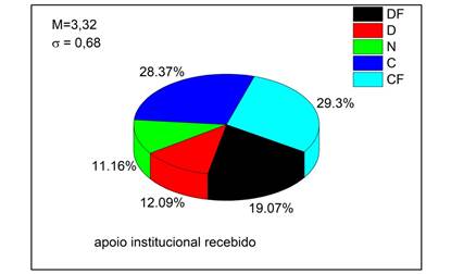 No último bloco, é levantada a percepção dos professores sobre os apoios institucionais disponíveis para sua atividade de docência. O resultado geral obtido foi (M=3,32; s=0,68), o que também indica uma posição de neutralidade, caminhando para a concordância. Os professores concordaram com as afirmações 23 e 24, o que indica que reconhecem a necessidade de investimentos para que se possa pensar em inclusão, além da necessidade do diálogo com um apoio especializado, o que é muito importante para o sucesso do ensino inclusivo. Os professores não concordaram com as afirmações 20 e 22 o que mostra que as instituições, de um modo geral, não estão preparadas para receber um estudante com deficiência, não podendo, assim, prestar auxílio para os professores. Já a afirmação 21, que indica a presença de professores da educação especial na instituição onde trabalham, obteve uma percepção neutra. O resultado é visto na Tabela VI e Fig. 4.