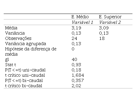 O resultado do teste t para a comparação entre as percepções dos professores que lecionam no Ensino Médio e no Ensino Superior, pode ser observado no Quadro 3. Dos 42 professores, 24 lecionam no Ensino Médio e 18 no Ensino Superior, com médias, respectivas, de 3,19 e 3,02. Trabalhamos, novamente, como o mesmo nível de significância a=0,05, que quando comparado com os valores obtidos para P uni-caudal= 0,178 e para o P bi-caudal= 0,357 indicam aceitação. O valor de Stat t=0,931 também passa nos testes uni-caudal (t crítico uni-caudal=1,68) e bi-caudal (t crítico bi-caudal=2,02). Logo, não podemos rejeitar nossa hipótese (3) de que não há diferenças entre as percepções dos professores que lecionam no Ensino Médio e os professores que lecionam do Ensino Superior.