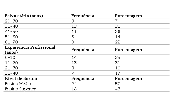 As técnicas de amostragem escolhidas foram propositivas e aleatória simples. Para a escolha dos professores que representam o perfil que buscávamos, utilizamos a técnica de amostragem intencional, já que buscamos apenas professores de Física. Como a coleta de dados dos entrevistados foi feita no período de restrições impostas pela pandemia do COVID-19, optamos pelo envio de formulários eletrônicos (Google Forms) que foram encaminhados para professores de Física do Ensino Médio e do Ensino Superior. Para isso, distribuímos o formulário em redes sociais oficiais fechadas de professores universitários e do Ensino Médio, comprovando, através dos dados pessoais, sua identidade. Ao atingir a quantidade de 42 respondentes, nos demos por satisfeitos e concluímos a fase de coleta dos dados. Não havia nenhum pré-requisito para que o professor respondesse ao questionário, além de lecionar Física em um dos dois níveis de seguimento (Ensino Médio ou Ensino Superior), portanto, apesar de podermos identificar em que instituição e localização geográfica o professor leciona, não achamos que estas informações seriam relevantes para a dimensão dos dados que analisamos. Ao contrário, mantemos uma amostragem intencional, de acordo com Bogdam & Biklen (1994), e Denzin & Lincoln 2018, apenas em se tratando de docentes de Física. Dos respondentes, foram 14 professores do sexo feminino e 28 do sexo masculino. A seguir, na Tabela I, apresentamos o perfil demográfico da nossa amostra.