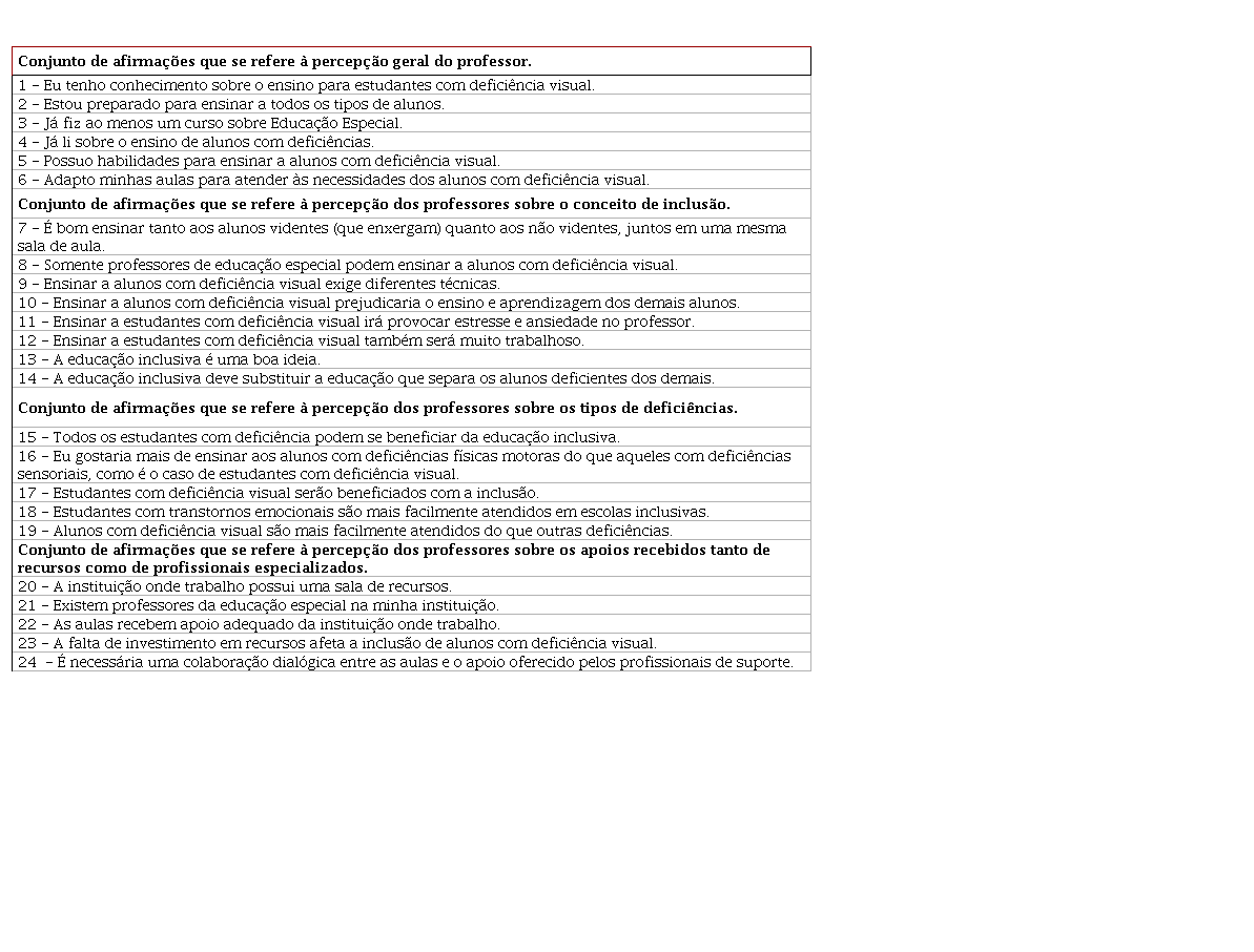 Direcionando nossos olhares em relação ao ensino de Física para estudantes com deficiência visual, devido às suas especificidades de um ensino majoritariamente visual, como já fora explicitado, decidimos aplicar o protocolo de afirmações utilizado na pesquisa com os professores de Gana para pesquisarmos as percepções de professores Física do Ensino Médio e do Ensino Superior sobre o ensino inclusivo de Física para estudantes com deficiência visual.