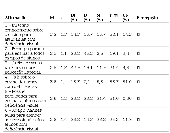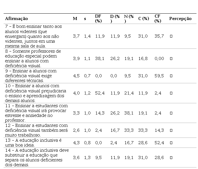 Na afirmação 11, os professores tiveram uma percepção positiva, indicando que não se sentirão estressados em lecionar para estudantes com deficiência visual. No entanto, na afirmação 12, talvez por falta de experiência com o ensino inclusivo, tiveram uma percepção negativa, indicando que acreditam ser muito trabalhoso ensinar para estudantes com deficiência visual.