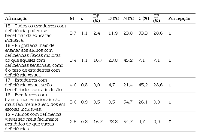 O terceiro bloco de afirmações visa identificar a percepção dos professores no que diz respeito à relação entre lecionar para estudantes com deficiência visual e estudantes com outras deficiências, tendo como resultados gerais (M=3,30; s=0,42), o que indica uma neutralidade tendendo para a concordância. Essa concordância fica mais explícita ao se analisar o resultado das respostas para cada afirmação. Houve concordância com as afirmações 15 e 17, indicando que os respondentes concordam que os estudantes com deficiência se beneficiarão com ensino inclusivo, sobretudo os estudantes com deficiência visual.