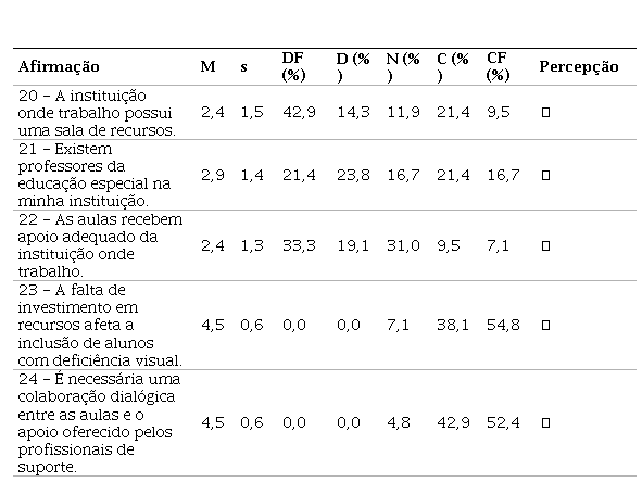 O último bloco de afirmações trata da percepção dos professores sobre os apoios recebidos de profissionais e recursos em suas aulas. Ainda que o resultado geral também apresente uma neutralidade, analisando individualmente as afirmações percebemos um problema que atinge diretamente a possibilidade de inclusão. Apesar deste trabalho focar no ensino inclusivo de estudantes com deficiência visual, este bloco de afirmações trata do tema inclusão de forma genérica. Considerando que muitas deficiências não são aparentes e fáceis de serem verificadas pelo professor, é desanimador observar que as instituições não estão preparadas para apoiar os professores, como poder ser constatado na discordância das afirmações 20 e 22.