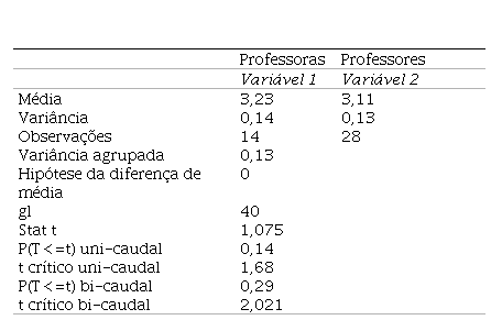 A realização do Teste t, que pode ser vista no Quadro 1, foi realizada para testar a hipótese (1), de que não há diferenças entre as percepções dos professores e das professoras. Para tanto, fizemos uso do programa Excel. Foram ao todo 14 professoras e 28 professores e fixamos o nosso nível de significância em a=0,05. A média para as professoras foi de 3,23 e para os professores de 3,10, portanto, valores muito próximos. O resultado para o valor da estatística do teste ficou em Stat t=1,07. Podemos fazer algumas análises para verificar se a hipótese deve ser confirmada ou rejeitada. Se olharmos o resultado encontrado para o valor de prova, P uni-caudal=0,144, observamos que é maior que o valor que escolhemos para o nível de significância (a=0,05), que seria o nosso erro, o que indica que devemos aceitar a hipótese. Obteremos o mesmo resultado se compararmos a a=0,05 com o P bi-caudal=0,28. O mesmo resultado também pode ser constatado através da análise limite delimitado pelo t crítico uni-caudal=1,68, já que o Stat t=1,07 é um valor inferior, encontrando-se dentro da região onde a chance de concordância é de 95%. Ainda, podemos analisar o t crítico bi-caudal=2,02, que impõe dois limites que vão de -2,02 e 2,02. Observamos que Stat t=1,07 encontra-se dentro desse limite. Todas essas análises nos fazem concluir que a hipótese (1) foi confirmada, ou seja, não podemos afirmar que haja diferença entre as percepções das professoras e dos professores.