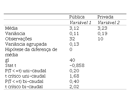 O Quadro 2 traz o resultado obtido para o Teste t realizado a fim de compararmos as percepções dos professores que lecionam em instituições públicas com os que lecionam em instituições privadas. Da nossa amostra de 42 professores, 32 trabalham em instituições públicas e 10 em instituições privadas. A média entre esses dois grupos também ficou muito próxima, 3,12 para os professores de instituições públicas e 3,23 para os professores de instituições privadas. Também podemos analisar e concluir a aceitação se comparamos o valor Stat t=-0,85 encontrado, tanto com o valor de t crítico uni-caudal=1,68, quanto para o t crítico bi-caudal=2,02. Logo, não podemos rejeitar nossa hipótese (2), ou seja, não há diferenças entre as percepções dos professores de instituições públicas e privadas.