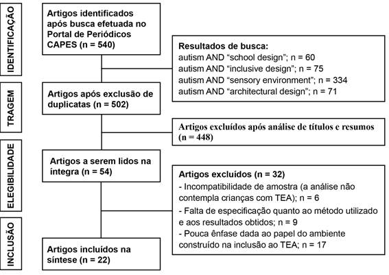 Na realização da presente revisão de literatura, buscou-se responder à seguinte pergunta de pesquisa: Quais características físicas podem auxiliar na concepção de ambientes inclusivos a crianças com TEA, de maneira a auxiliar na diminuição de crises comportamentais e no desenvolvimento de novas habilidades e competências? Para tanto, as seguintes etapas foram realizadas: (a) delimitação do objetivo de pesquisa; (b) escolha das fontes de dados; (c) escolha dos descritores para busca; (d) busca e armazenamento dos resultados; (e) seleção dos artigos a partir dos critérios de inclusão e exclusão; (f) extração dos dados dos artigos selecionados; (g) avaliação dos artigos e (h) síntese e interpretação dos dados (KOLLER, COUTO, HOHENDORFF, 2014). Foi consultado o Portal de Periódicos CAPES, uma biblioteca virtual que reúne diversas bases de dados em seu acervo. A utilização do Portal de Periódicos da CAPES, em detrimento da consulta às bases de dados específicas, justifica-se pela escassez de publicações acerca de ambientes inclusivos ao TEA, fazendo-se necessária a ampliação das bases de dados consideradas para a obtenção de um número expressivo de resultados.
