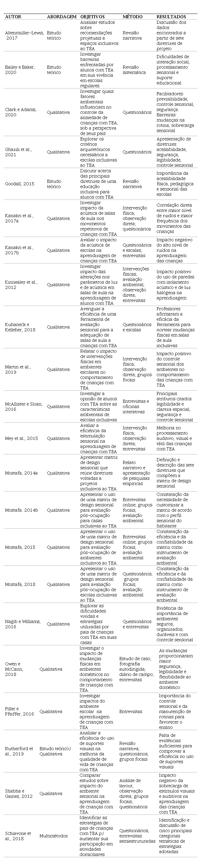 Ainda, dois artigos (MOSTAFA, 2014a; KUHANECK e KELLEHER, 2018) se destacam por utilizarem em seu método a aplicação de ferramentas específicas para a concepção e avaliação de ambientes inclusivos a crianças com TEA. Mostafa (2014a) apresenta a chamada Matriz de Design Sensorial ASPECTSS™, uma ferramenta desenvolvida pela autora a partir de pesquisas empíricas em espaços domésticos e escolares, e que auxilia na geração de estratégias espaciais destinadas ao desenvolvimento de ambientes adequados a crianças com TEA. Kuhaneck e Kelleher (2018), por sua vez, apresentam a chamada Avaliação do Ambiente Sensorial em Sala de Aula (CSEA), desenvolvida pelos autores por uma série de estudos empíricos em ambientes escolares, e que objetiva auxiliar professores de escolas inclusivas ao TEA a avaliarem a qualidade do ambiente sensorial de salas de aula, de modo a guiar futuras intervenções físicas em tais espaços.