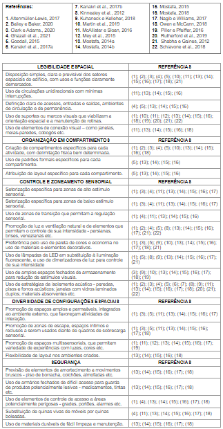Os dados obtidos dos artigos considerados foram examinados por meio de análise temática, de modo a possibilitar a identificação, análise, organização e discussão dos temas emergentes aqui considerados (BRAUN e CLARKE, 2006). Dessa maneira, os dados encontrados foram sumarizados a partir de cinco principais categorias de diretrizes espaciais: legibilidade espacial; organização em compartimentos; zoneamento sensorial; diversidade de configurações espaciais; e segurança. Cada uma dessas categorias, por sua vez, abrange um conjunto de estratégias espaciais a serem adotadas na concepção de projetos arquitetônicos inclusivos ao TEA.