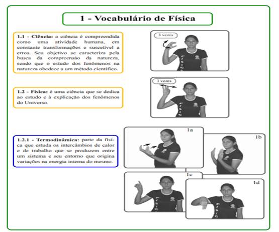 Os princípios colaborativos da cibercultura nos trazem inúmeras possibilidades no que diz respeito ao uso e difusão das línguas de sinais, como o projeto “Sinalizando a Física”7 da Universidade Federal do Mato Grosso, publicado em 2010, com licença Creative Commons, e distribuído gratuita e livremente em PDF pela Internet, que se contrapõe diretamente à visão do material mencionado anteriormente. Esse material se refere a uma língua viva, em constante mudança; ou seja, admite que os sinais podem sofrer modificações pelo uso. A equipe apresenta três volumes com centenas de verbetes agrupados em grandes temas na área da física, e inicia o livro dedicando-o à comunidade surda, que “mesmo vivendo no século XXI, ainda é obrigada a lutar por um direito básico presente em diversos discursos, mas carente de ações: a Educação” (Figura 6).