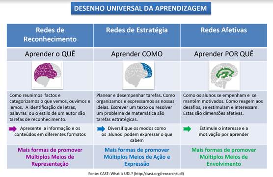Diante disso, o DUA favorece o pensar e o agir cooperativo, para além de uma mera adaptação ou personalização de uma atividade para um estudante, no sentido de reconstruir estratégias diferenciadas capazes de mobilizar o conhecimento de todos. Assim, ao elaborar um material com método tátil, por exemplo, que auxilia na visualização das estruturas celulares com materiais tridimensionais e com o uso de legenda em braille (nomes das estruturas celulares tridimensionais), atingimos não somente o estudante com deficiência visual, mas, nessa perspectiva, o mesmo material pode ser explorado por todos os estudantes da turma, de modo que todos se beneficiem ao entendimento do conteúdo. Estes aspectos têm sua premissa com base em estudos de três grandes sistemas corticais do cérebro que estão envolvidos durante a aprendizagem, a saber: redes de reconhecimento, estratégicas e afetivas (ZERBATO; MENDES, 2018).