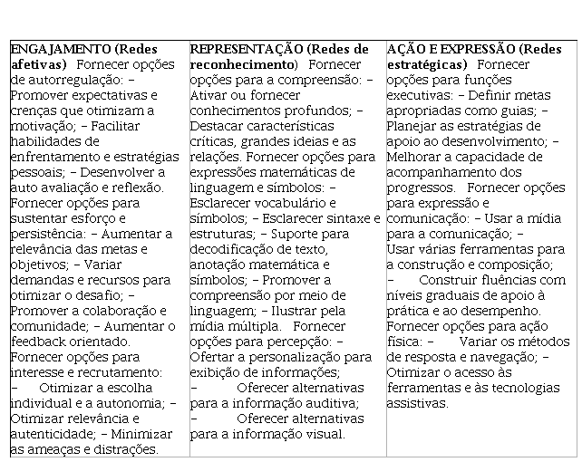 O princípio relacionado às redes estratégicas de DUA é a ação e expressão, que pode ser compreendida pela avaliação da aprendizagem, mas os estudantes necessitam de apoio e orientações que possibilitem aprender em todos os momentos. Então, na ação e expressão articulam-se estratégias para processar o conhecimento com o fornecimento de feedbacks relevantes e contínuos, por exemplo. Para melhor ilustrar esses três princípios que orientam o DUA na elaboração e planejamento de atividades, estratégias e materiais acessíveis, Zerbato (2018) elaborou o seguinte quadro, com base em Nelson (2014).