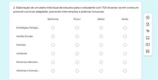 Os instrumentos de produção de dados se constituíram em um conjunto de questionários, elaborados de modo distinto para cada grupo específico de colaboradores, considerando suas particularidades. Os questionários apresentaram questões abertas e fechadas e, assim, buscou-se mensurar e analisar como os colaboradores compreendem alguns modelos de ações inclusivas, além de apontarem pontos relevantes para melhorias contínuas e sustentáveis no processo inclusivo de estudantes com TEA.