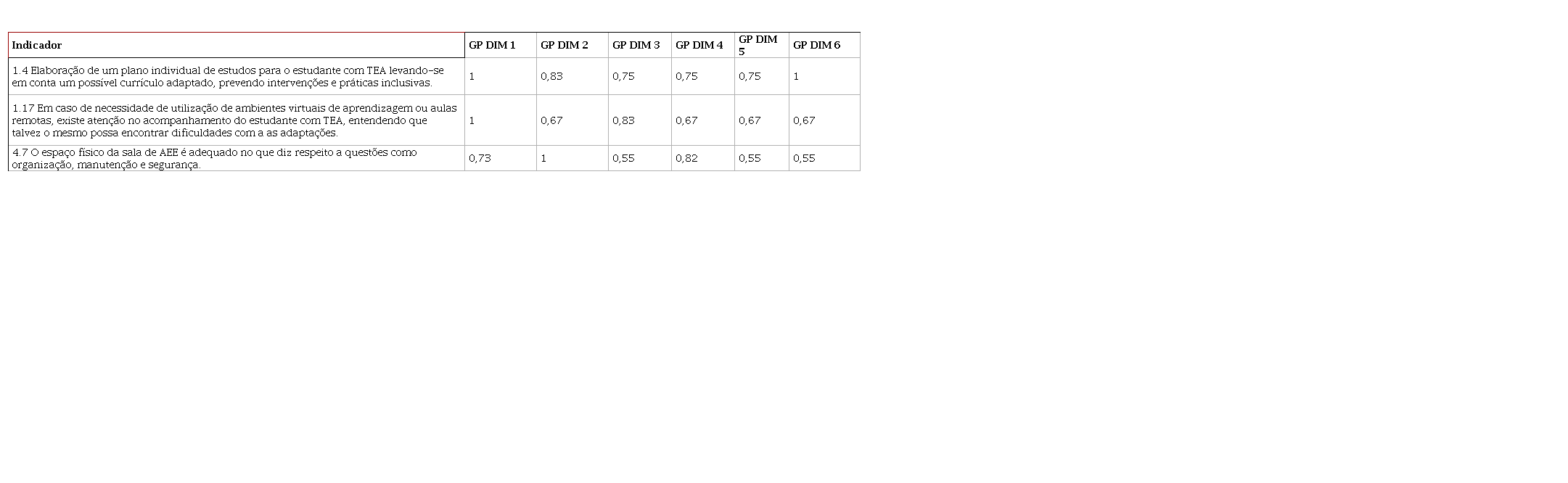 O conhecimento dos colaboradores também nos diz que, embora o Indicador 1.4 pertença à Dimensão 1, este também pertence à Dimensão 6, que se refere às Estruturas de Organização Inclusiva e Políticas Públicas. Outro ponto importante a se destacar é em relação ao Indicador 1.17. Esta discussão ganha muita relevância neste momento em que os ambientes virtuais de aprendizagem têm um papel crucial na manutenção do vínculo dos estudantes com a escola. Os colaboradores apontaram que o Indicador pertence totalmente à Dimensão 1. No entanto, apresenta um grau de pertinência igual a 0,83 em relação à Dimensão 3, que se refere às Famílias.