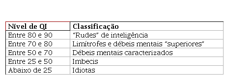 Além do teste de Binet-Simon, o teste de Binet-Terman também era utilizado no Brasil para realizar avaliações de inteligência, teste sobre o qual Ernani Lopes – presidente da Liga Brasileira de Higiene Mental e psiquiatra da Assistência a Psicopatas – apresenta orientações relativas à interpretação dos dados, em seu artigo publicado na primeira edição do ABHM de 1931 (LOPES, 1931). De acordo com o autor, o QI mensurado pelo referido teste deveria ser o resultado da relação entre a idade mental e a idade cronológica do indivíduo – considerados dentro da média os resultados entre 90 e 110 – sendo estabelecida uma escala de classificação decrescente a partir da referência de normalidade estabelecida (Tabela 1). Em escala ascendente, estariam as inteligências superiores à média (110-120), os talentos (120-140) e os supra-normais genuínos (acima de 140). O autor indica a importância da complementação da avaliação de QI com informações sobre o estado social, ocorrências escolares, qualidade dos trabalhos escolares e defeitos físicos, além de observações sobre o comportamento da criança no momento da aplicação do teste.