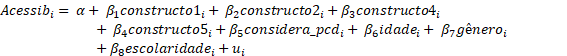 A variável dependente no modelo (“acessib”) consistia em uma nota atribuída pelos respondentes às condições gerais de acessibilidade na UEA, variando no intervalo de 1 a 10, correspondendo, portanto, a uma variável métrica. Em termos de variáveis independentes, no modelo foram incluídas, além dos constructos que serão discutidos adiante, a variável referente ao gênero do respondente (“gênero” – variável dummy onde 0 é feminino e 1 é masculino), a escolaridade (variável categórica variando de forma crescente entre 1-Ensino Médio Incompleto e 8-Doutorado Completo), a idade do respondente, além de este se considerar Pessoa com Deficiência (“considera_pcd” – variável dummy onde 1 é sim e 0 é não).