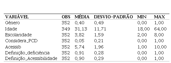Constam, na Tabela 1, as estatísticas descritivas que evidenciam o perfil médio dos respondentes da pesquisa. Em relação ao gênero, cerca de 40% dos respondentes eram do sexo masculino, com aproximadamente 31 anos e escolaridade variando entre ensino superior incompleto a completo. Dos respondentes, 5% se consideravam pessoa com deficiência, sendo mais frequente a deficiência física e a intelectual. Além disso, os questionários foram, em sua grande maioria, aplicados a discentes (249), docentes (71) e técnico-administrativos (24).