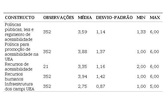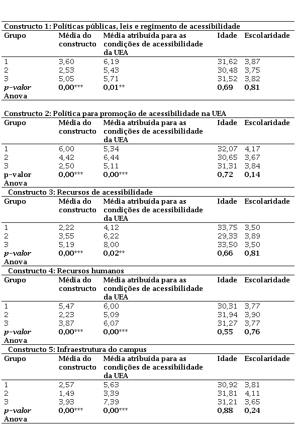 A Anova indicou que as médias de cada constructo eram, de fato, diferentes, evidenciando a existência de três grupos de notas: alta, média e baixa. Na sequência, percebeu-se que as notas dadas pelos respondentes à acessibilidade da UEA eram diferentes em cada agrupamento para todos os constructos da análise. Assim, os constructos guardam relação com a percepção da acessibilidade como um todo por parte dos respondentes.