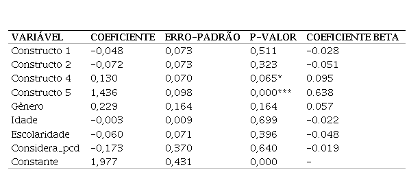 Por fim, os dados foram submetidos a uma regressão linear múltipla, visando identificar relações entre as variáveis. É importante ressaltar que o constructo 3 não foi incluído nesta etapa por possuir somente 21 observações. O Teste F confirmou a significância geral do modelo a um nível de significância de 1%. Além disso, o R2 ajustado era de 0,4344, revelando que mais de 43% das variações na nota de acessibilidade da UEA eram explicadas pelas variações das variáveis independentes do modelo. Constam, na tabela 5, os resultados encontrados.