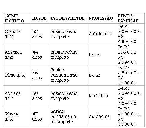 A idade das mães participantes varia de 30 a 47 anos, três delas possuem Ensino Médio Completo (D1, D2, D4). A renda familiar de três díades está entre 3 e 5 salários mínimos (D1, D3, D4). As participantes relataram que costumam contar histórias com livros infantis aos seus filhos, dessa forma, duas mães costumam contar histórias com livros infantis uma vez por semana (D2, D4) e duas relataram que realizam a contação de história uma vez ao mês, com livros enviados pela escola das crianças (D1, D5).