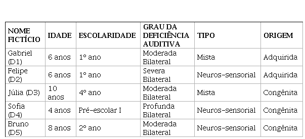 Das cinco crianças participantes da pesquisa, três são do gênero masculino (D1, D2, D5) e possuem idades entre 4 e 10 anos. O grau da deficiência auditiva varia entre moderada, severa e profunda, e todas se caracterizam como bilaterais. O tipo da perda auditiva caracteriza-se como mista (D1, D3) ou neurossensorial1 (D2, D4, D5). Além disso, três crianças apresentam origem congênita da deficiência auditiva (D3, D4, D5). Todas as crianças usam Aparelho de Amplificação Sonora Individual (AASI) em ambas as orelhas que fornecem o ganho acústico necessário de acordo com sua perda auditiva. Gabriel (D1) utiliza também o Sistema FM2 na escola. Além desses dados, Bruno (D5) apresenta laudo médico para Transtorno de Déficit de Atenção e Hiperatividade com características para Autismo infantil.