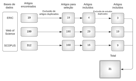 Os artigos foram selecionados, com base nos critérios de inclusão/exclusão descritos acima, por meio da leitura do título e do resumo, e sequencialmente pela leitura na íntegra para confirmar ou excluir a seleção. Vale ressaltar que, para manter a confiabilidade dessa revisão sistemática, quando os resultados de busca, apresentados pelas bases de dados, foram atas ou anais de eventos/congressos, a pesquisadora buscou identificar e analisar, dentre os artigos que compunham os arquivos do evento, aquele que atendia aos termos de busca.