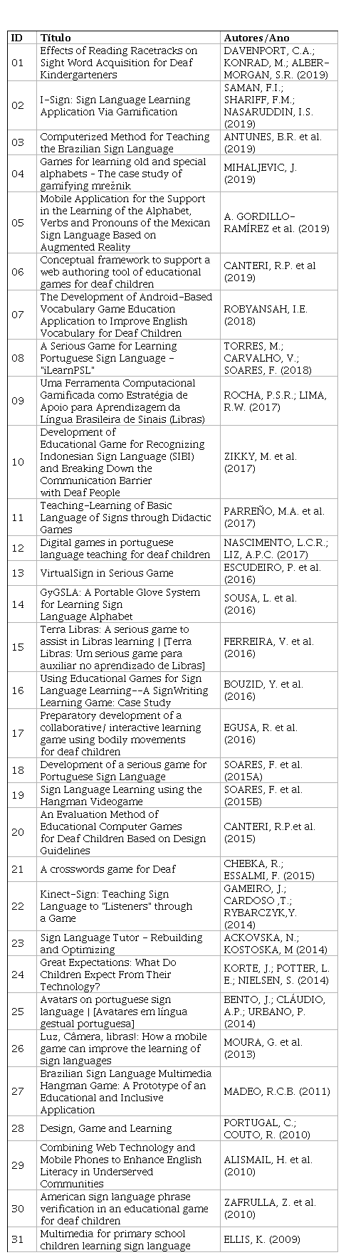 A seleção de artigos observou critérios de inclusão e exclusão. Os critérios de inclusão foram artigos: 1) sobre jogos educativos para pessoas surdas ou para o ensino de língua de sinais e 2) que apresentassem um jogo voltado ao ensino da língua de sinais ou de língua oral escrita para surdos.