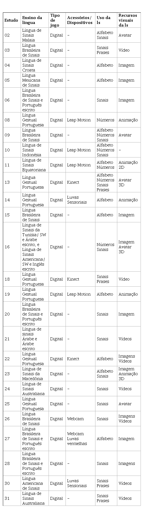Foram excluídos artigos que não atenderam aos critérios de inclusão por apresentarem jogos para estudantes surdos com foco no ensino de conteúdo/disciplina (matemática, geografia, etc.), na terapia da fala/audição, comunicação ou outras habilidades/funções cognitivas. Foram excluídos também pesquisas bibliográficas e revisões sistemáticas de literatura.
