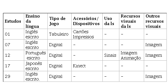 Faz-se necessário lembrar que o ensino de uma língua oral escrita para surdos parte das habilidades cognitivas anteriormente adquiridas pela língua de sinais. Dessa forma, compreendemos que a presença da língua de sinais nos jogos que visam o ensino da língua oral escrita pode ser relevante para a aprendizagem dos estudantes surdos. Outra alternativa é a língua de sinais estar presente na mediação em sala, como no caso dos jogos dos estudos de Davenport, Konad, Alber-morgan (2019) e de Egusa et al. (2016), em que a mediação permitia a interação em língua de sinais entre os pares e mediadores.
