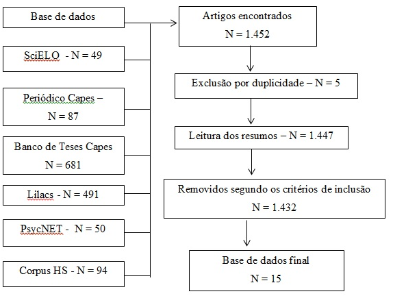 Os critérios de inclusão para seleção dos artigos foram: (a) estudos que descreveram intervenções diretas com o objetivo de promover HS em crianças ou adolescentes com TEA; (b) ter a publicação na íntegra, e (c) ser de acesso livre. Foram excluídas as publicações que não atendessem aos critérios acima. Após a leitura e análise dos resumos, foi realizado o fichamento dos artigos selecionados. No total, foram analisadas, de forma descritiva, 15 produções, conforme demonstra a Figura 1. Esses artigos foram lidos na íntegra e realizou-se a análise dos procedimentos adotados nos programas de intervenção descritos (delineamento de pesquisa, caracterização de participantes, tipo e contexto da intervenção e principais resultados).