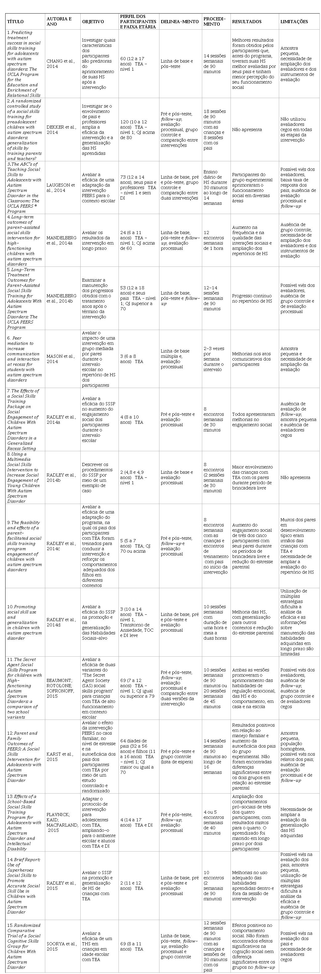 De modo geral, as intervenções analisadas promoveram uma ampliação no repertório de HS dos participantes. No entanto, os autores mencionaram as seguintes limitações: amostra reduzida (CHANG et al., 2014; MASON et al., 2014; RADLEY et al., 2014a; 2015; KARST et al., 2015); ausência de avaliadores cegos (DEKKER et al., 2014; RADLEY et al., 2014a; BEAUMONT; ROTOLONE; SOFRONOFF, 2015; SOORYA et al., 2015); ausência de grupo controle (MANDELBERG et al., 2014a; 2014b; BEAUMONT; ROTOLONE; SOFRONOFF, 2015; RADLEY et al., 2015); ausência de avaliação processual (LAUGESON, et al., 2014; MANDELBERG et al., 2014b; KARST et al., 2015); ausência de avaliação de follow-up (LAUGESON, et al., 2014; RADLEY et al., 2014a; 2015; KARST et al., 2015; possível viés dos avaliadores (LAUGESON, et al., 2014; MANDELBERG et al., 2014b; BEAUMONT; ROTOLONE; SOFRONOFF, 2015; KARST et al., 2015; RADLEY et al., 2015; SOORYA et al., 2015); necessidade de ampliação de avaliadores e instrumentos de avaliação (CHANG et al., 2014; MANDELBERG et al., 2014a; MASON et al., 2014; RADLEY et al., 2014c; PLAVNICK, KAID; MACFARLAND, 2015) e resultados limitados à amostra (TEA com nível de apoio leve) (MANDELBERG et al., 2014a; KARST et al., 2015). Somado a isso, em dois estudos (RADLEY et al., 2014d; 2015), a utilização de múltiplas estratégias dificultou a identificação daquelas que realmente estão relacionadas à ampliação do repertório de HS dos participantes.