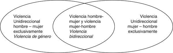 En parejas heterosexuales la dirección de la violencia ejercida hacia la pareja puede ser unidireccional hombre-mujer (violencia de hombre a mujer exclusivamente y asociado a la violencia de género o violencia machista), unidireccional mujer-hombre (violencia de mujer a hombre exclusivamente) o bidireccional (ambos miembros de la pareja actúan al mismo tiempo como víctima y agresor) (ver figura 1).