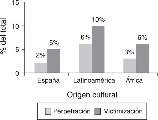 La tasa de perpetración de violencia de pareja, χ2(2, N = 251) = 6.39, p = .041, y la de victimización de pareja, χ2(2, N = 251) = 6.99, p = .030, variaba en función del origen sociocultural. Según la figura 2 y análisis estadísticos complementarios realizados, se confirma que las personas procedentes de Latinoamérica (6%) declararon niveles de perpetración de violencia de pareja algo superiores que las personas autóctonas (2%), χ2(1, N = 147) = 3.97, p = .046] y las personas procedentes de África (3%), χ2(1, N = 181) = 4.56, p = .033]. La tasa de victimización declarada por el grupo de Latinoamérica (10%) era superior que la tasa del grupo de África (6%), χ2(1, N = 181) = 6.40, p = .011.