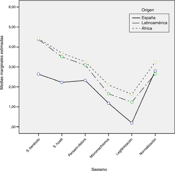 Los resultados del análisis MANOVA 6 x 3 x 2 con sexismo y otras creencias (sexismo benévolo, sexismo hostil, micromachismos, sesgos cognitivos, gravedad y frecuencia de la violencia de género) como factor de medidas repetidas, el origen cultural (España, Latinoamérica y África) y el sexo (hombre vs. mujer) como factores de medidas independientes, mostraron el efecto principal del sexo, F(1, 145) = 16.72, p < .001, η2 = .010, de manera que los hombres presentaban mayores niveles de sexismo que las mujeres (figura 3).